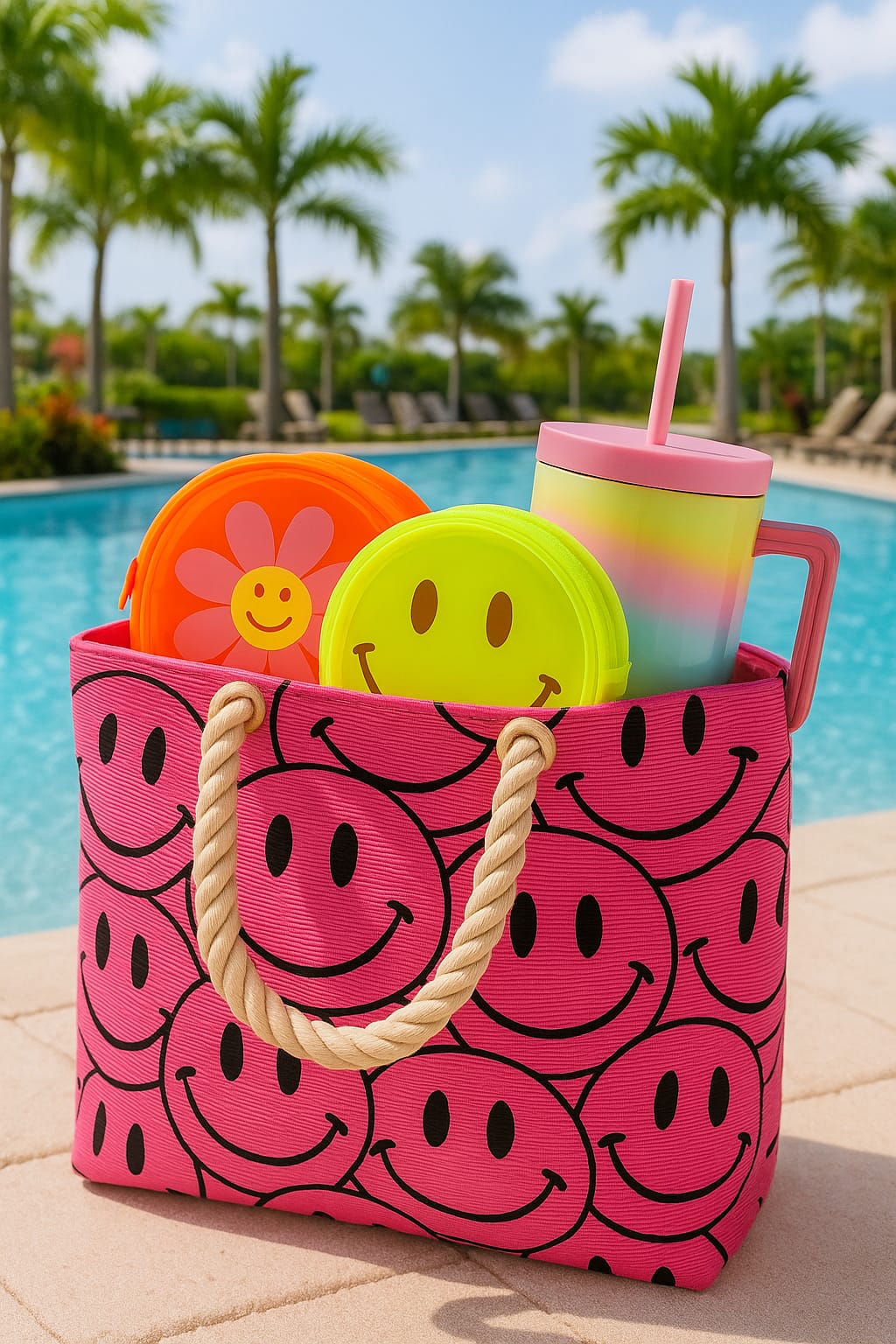 I took it to the beach and fit FOUR big towels, two tumblers, sunscreen, snacks — literally everything. It’s lightweight but super strong, and the rope handles are comfy to carry even when it’s full. Also… the smiley design is a total mood booster 🌞💛